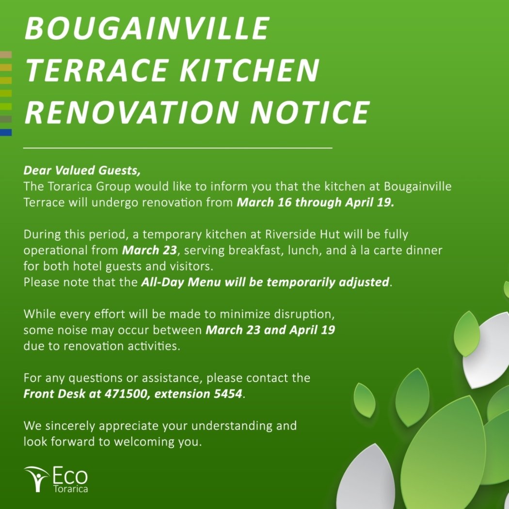 Our kitchen at Bougainville Terrace will be closed from March 16 through April 19 due to renovation work.